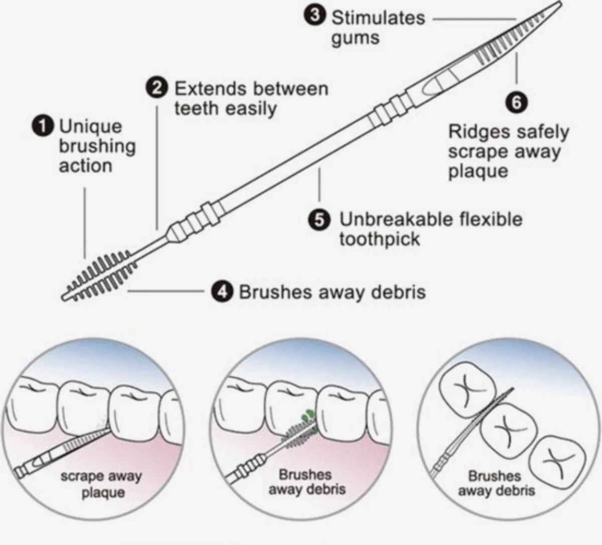 Onbreekbare tandenstokers met unieke borstelfunctie. Tandartsen adviseren de meeste patiënten om naast het poetsen ook dagelijks te stoken en te ragen. De nieuwe hoogwaardige kunststof 2TH PICKS hebben de ideale combinatie om de mondhygiëne te verbeteren en het gebit op de lange termijn gezond te houden. Ze verwijderen etensresten en tandplak door middel van effectieve ribbels en stimuleren de doorbloeding van tandvlees, zonder beschadiging van kronen en bruggen.