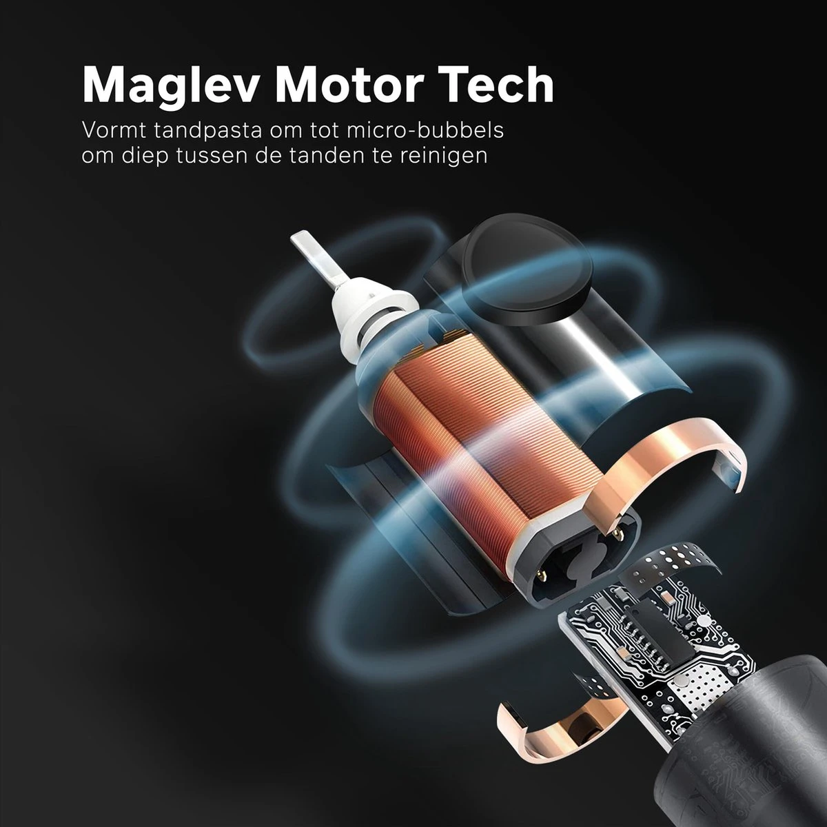 40.000 VPM Slimme tandenborstel – schoonheid, hersens en kracht. De Black-serie is een moderne elektrische tandenborstel van wereldklasse, boordevol met de modernste technologie. Hij beschikt over een ultra-krachtige en toonaangevende motor die 40000 trillingen per minuut produceert, een lithium-ion batterij, supersnel draadloos opladen, 4 standen, slimme vibratietimers, 8 door DuPont ontworpen borstelkoppen en borstelharen, en een op maat gemaakte reisetui; dit alles met een slank, lichtgewicht en IPX7 waterproof ontwerp.