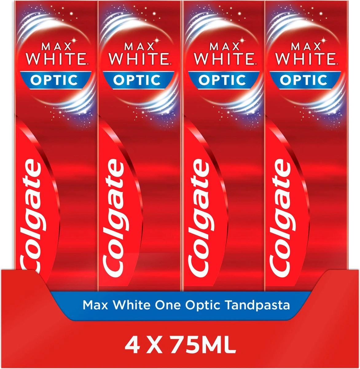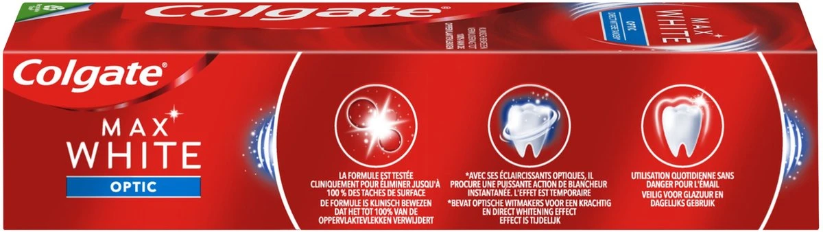Colgate Max White Optic Whitening tandpasta zorgt voor direct* mooie, witte tanden. De Colgate Max White Optic tandpasta bevat een klinisch bewezen formule dat 100% van de oppervlaktevlekken verwijdert. De Colgate Max White Optic tandpasta bevat optische witmakers voor een krachtig en direct whitening effect. Het effect is tijdelijk. Klinisch bewezen formule en dagelijks gebruik is veilig voor het glazuur.