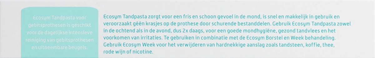 Ecosym Tandpasta voor gebitsprothesen voor de dagelijkse reiniging van jouw gebitsprothese of beugel. Om zo lang mogelijk plezier te houden van uw prothese of beugel is goed onderhoud belangrijk. Reguliere tandpasta is niet geschikt voor de reiniging van prothesen, beugels of sportbitjes. Reguliere tandpasta heeft namelijk een schurende werking en veroorzaakt krasjes en ruwe oppervlakten en kunnen vuil en bacteriën zich makkelijker hechten op jouw prothese of beugel. En reiniging met alleen water is geen goede hygiënische reiniging. Reinig daarom dagelijks jouw prothese of beugel met Ecosym Tandpasta. Deze tandpasta bevat géén schurende ingrediënten. De voordelen van Ecosym Tandpasta voor gebitsprothesen: – Optimale reiniging voor iedere dag – Veroorzaakt géén krasjes op de gebitsprothese – Snel en gemakkelijke reiniging – Schoon en fris gevoel in de mond – Geschikt voor gedeeltelijke en volledige gebitsprothese, uitneembare beugels en sportbitjes. Ecosym wordt aanbevolen door tandarts en tandtechnicus.