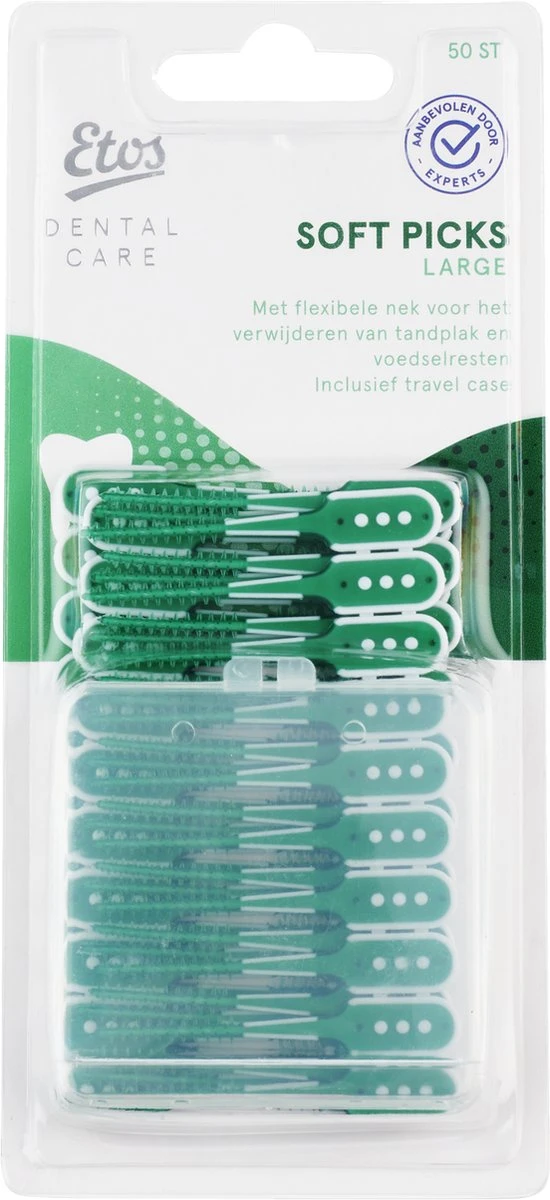 Etos soft picks L zijn flexibele tandenstokers met een siliconen buitenkant. Door het flexibele handvat zijn alle ruimtes goed te bereiken.