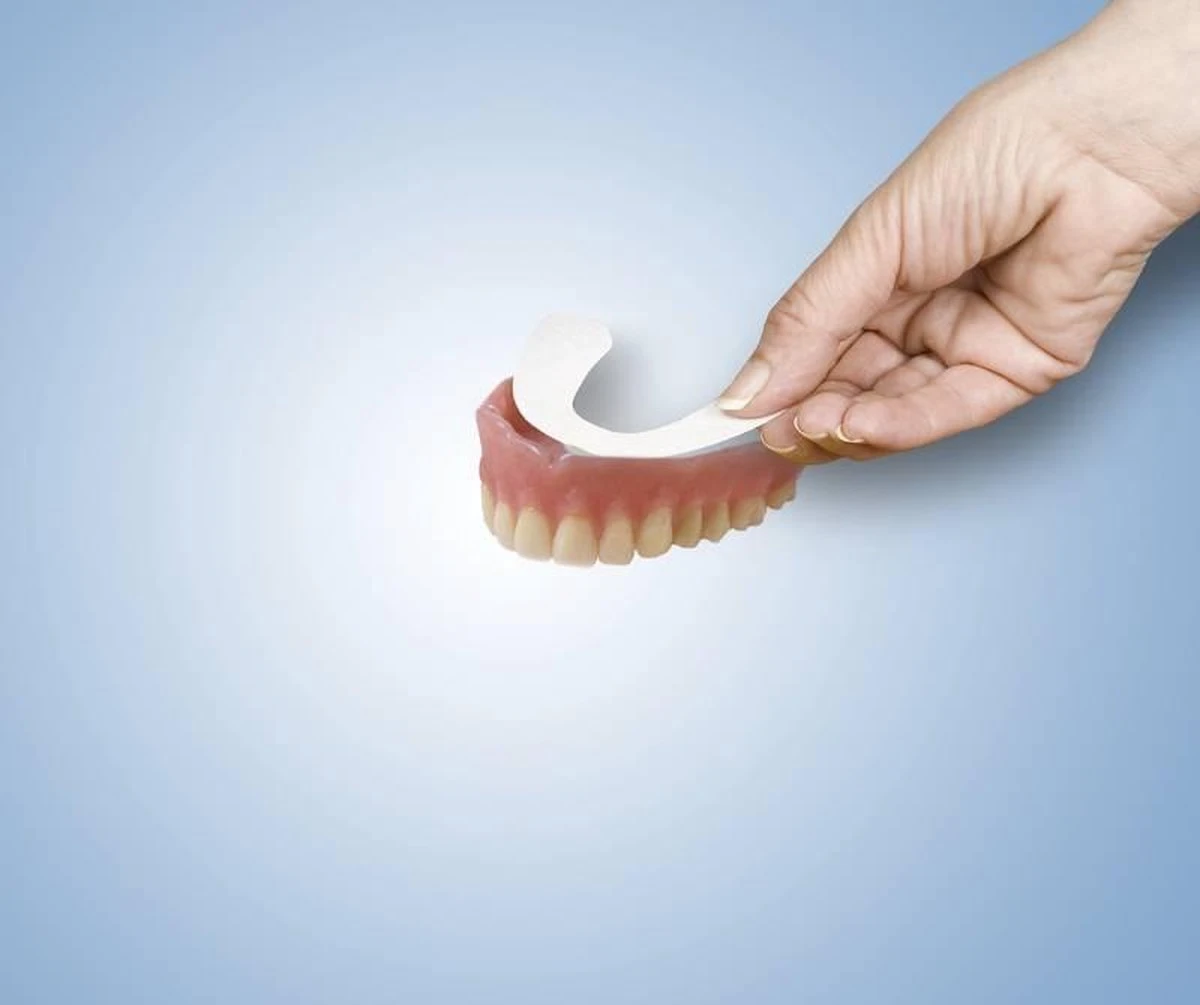 Zo’n kussentje bestaat uit vederlicht wafelachtig materiaal, dat zich onmiddellijk aan de gebitsplaat en de kaakranden met het gehemelte hecht. Bij ’t uitnemen laat het ook weer gemakkelijk los. Elk kussentje kan perfect op maat worden geknipt, geschikt voor elk boven- en ondergebit of deel-prothese.