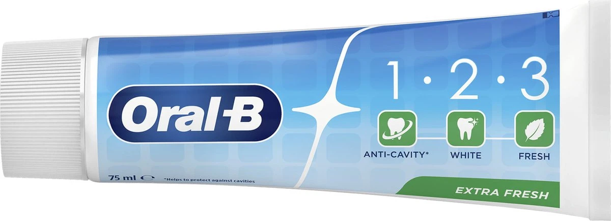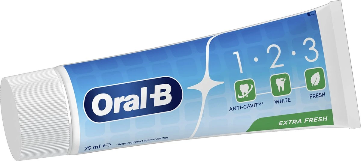 Oral-B 1.2.3 tandpasta is ideaal voor het hele gezin en biedt bescherming tegen gaatjes en voorkomt tandbederf.