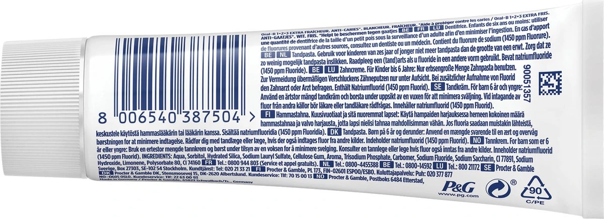 | Ingrediënten | Aqua, Hydrated Silica, Sorbitol, Sodium Lauryl Sulfate, Cellulose Gum, Aroma, Sodium Saccharin, Sodium Fluoride, Carbomer, CI 77891, Trisodium Phosphate, Limonene, Polysorbate 80, CI 74160 |
