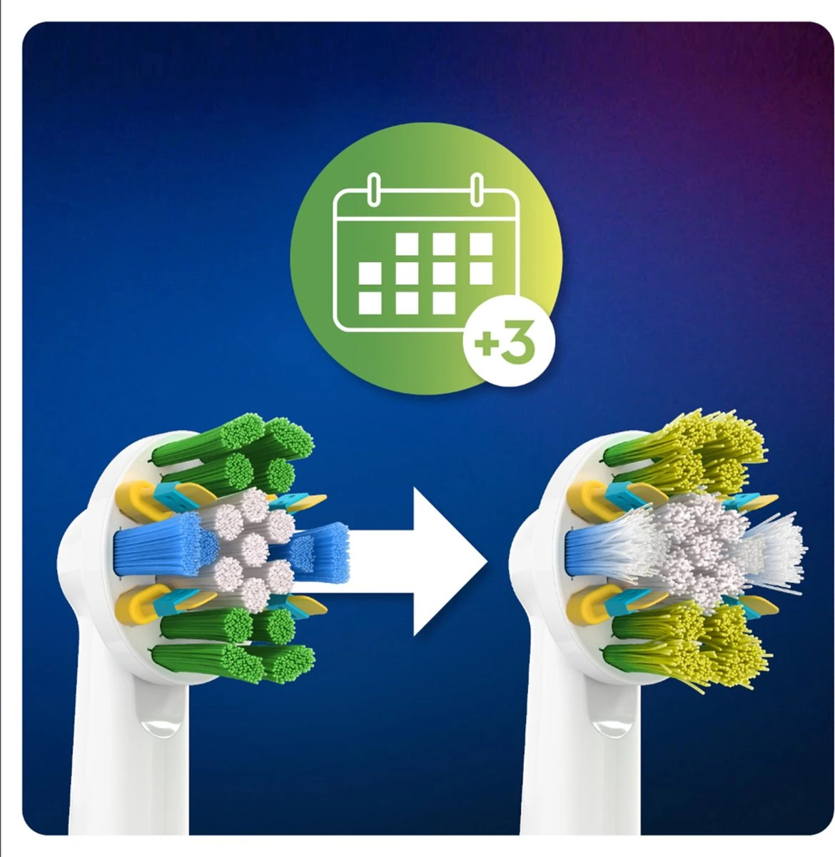 De FlossAction is een van Oral-Bs hoogwaardige vervangende opzetborstels. Hij beschikt over speciaal ontwikkelde MicroPulse-borstelharen die tandplak losmaken om tot 100% meer tandplak te verwijderen dan een gewone manuele tandenborstel. De verbeterde FlossAction opzetborstels van Oral-B zijn ontwikkeld met CleanMaximiser-technologie die de groene borstelharen geel maakt voor optimale prestaties van de opzetborstel en de beste reiniging. De unieke ronde borstelkop en borstelharen reiken diep tussen de tanden voor een optimale dekking van de tanden. Verenigbaar met alle Oral-B-handvatten, behalve Pulsonic en iO.
