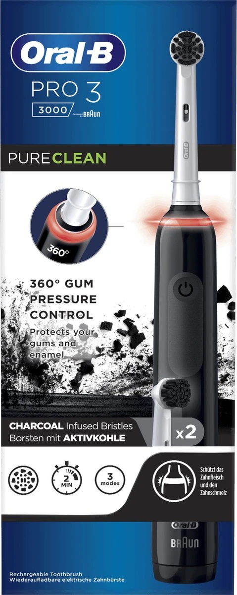 Ervaar de Oral-B Pro 3 van het nummer één meest gebruikte tandborstelmerk door tandartsen wereldwijd. Het slanke handvat van de Pro 3 elektrische tandenborstel helpt u te poetsen zoals uw tandarts dat aanbeveelt: Het helpt u 2 minuten poetsen met de professionele timer en meldt u om de 30 seconden dat u een andere zone moet poetsen. U beweegt de borstel gewoon in uw mond en de unieke, ronde borstelkop van Oral-B doet de rest. Dankzij borstelharen met houtskool reinigt deze 100% meer tandplak dan een gewone manuele tandenborstel. Dat is niet alles, de tandenborstel helpt u ook uw gevoelige tandvlees te beschermen met de 360 ̊ poetsdrukcontrole die de poetssnelheid vermindert en u waarschuwt als u te hard poetst. De Oral-B Pro 3 tandenborstel is onmisbaar voor iedereen die naar een elektrische tandenborstel wil overschakelen en zijn mondgezondheid wil verbeteren.