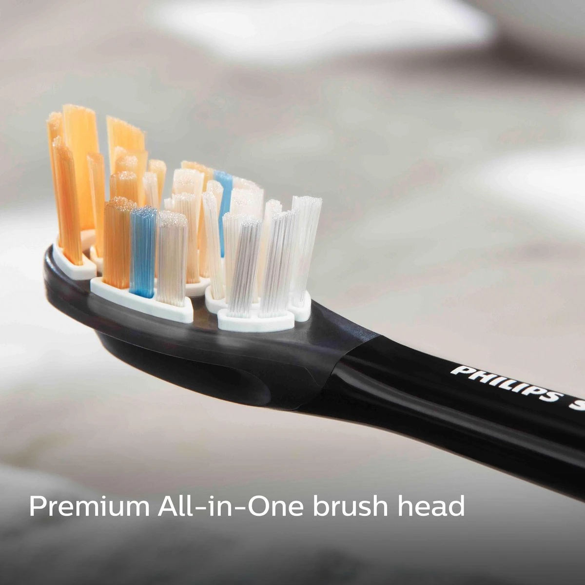 Poets zonder compromissen met de A3 Premium alles-in-één opzetborstel — onze beste borstel ooit. De borstelharen staan in een specifieke hoek en verwijderen zo tot wel 20x meer tandplak, zelfs op moeilijk bereikbare plekken*. Driehoekige uiteinden verwijderen tot 100% meer vlekken in minder dan twee dagen*** en de langere borstelharen zorgen voor een grondige reiniging van jouw tandvlees, dat tot 15x gezonder wordt in slechts twee weken**. Een complete verzorging zonder van opzetborstel te hoeven veranderen. Wist je dat opzetborstels minder effectief worden na 3 maanden gebruik? Onze BrushSync™-functie kan je eraan herinneren wanneer het bijna tijd is om ze te vervangen.