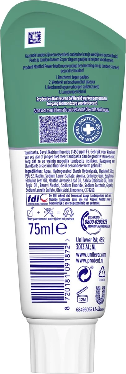 Prodent Menthol Power tandpasta bevat munt en eucalyptus voor een extra frisse adem. Prodent tandpasta biedt bovendien meervoudige bescherming om je tanden sterk en gezond te houden. Het beschermt je tanden tegen gaatjes en verborgen suiker(zuren), versterkt het tandglazuur en zorgt voor langdurige frisheid. Gezonde tanden zijn essentieel onderdeel van je welzijn en gezondheid. Poets je tanden daarom 2x per dag met Prodent Menthol Power tandpasta om gaatjes te helpen voorkomen.