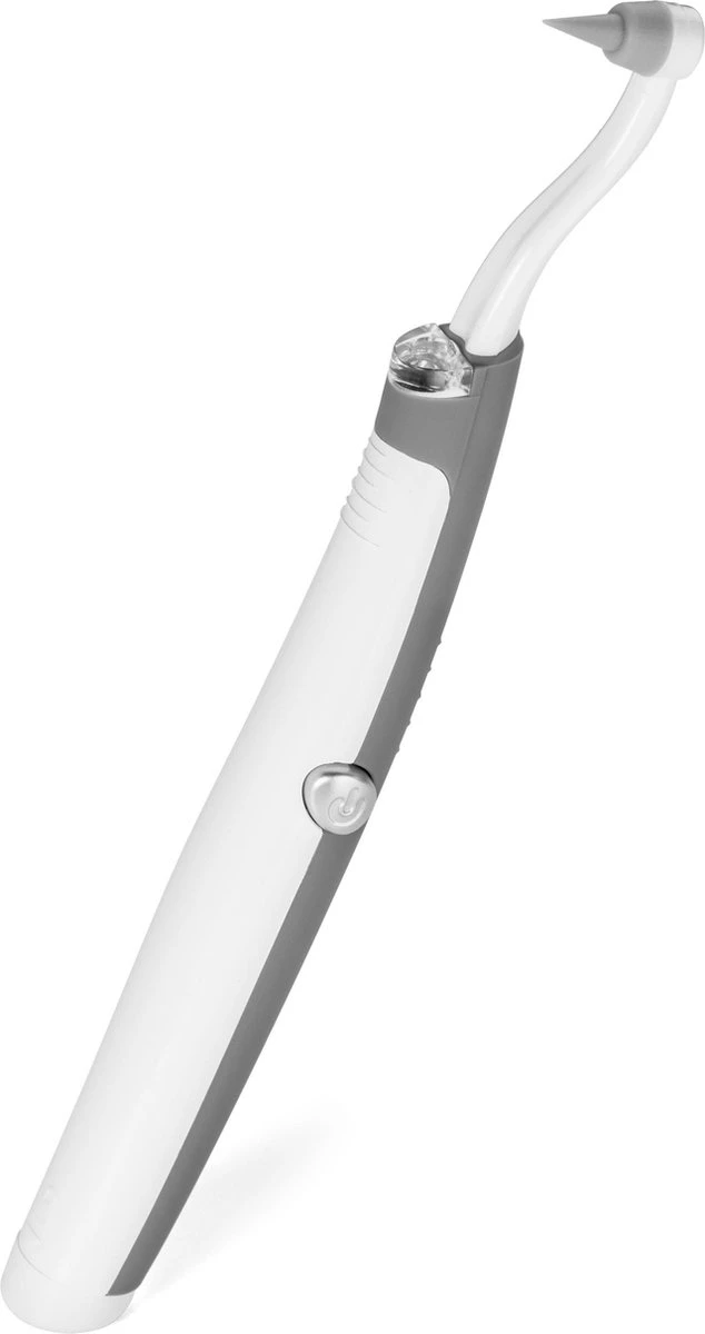 - Druk op de aan-uitknop op de zijkant om de Sonic Pic aan te zetten. Houd het apparaat vervolgens voorzichtig tegen uw tanden om ze te reinigen.